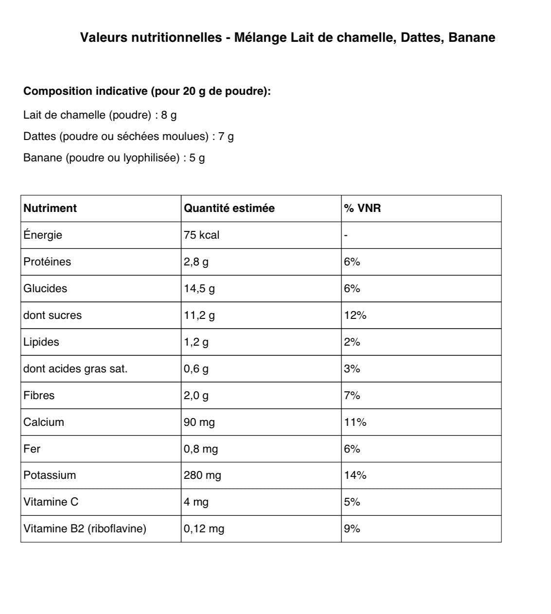 Découvrez un super-aliment unique et ancestral avec notre booster au lait de chamelle, associé à la douceur des dattes et à la puissance nutritive des bananes lyophilisées. Une formule onctueuse, complète et naturellement sucrée pour soutenir votre énergie, vos défenses et votre récupération.